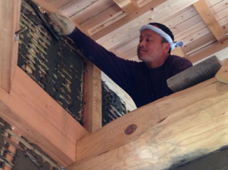 すでに壁塗りで、腕がパンパンな棟梁です。