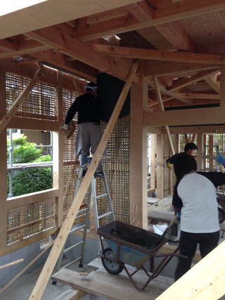 新城のお宅の竹木舞も組み終わって、今日から土壁塗りです。