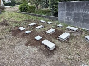 今週は、お社、荒神様の基礎ブロックを積み、万年塀を設置してきました。