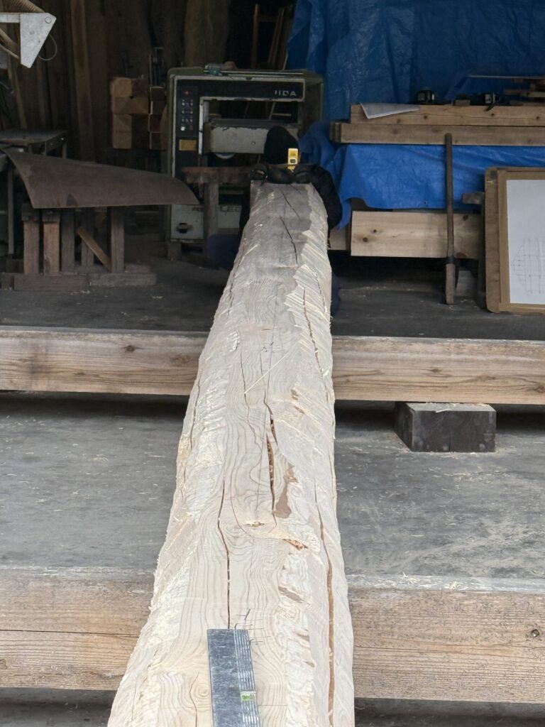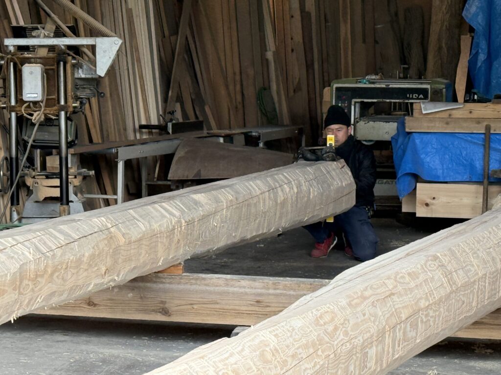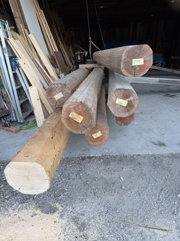 丸太は、平成元年、平成二年の乾燥してあった、桧の丸太です。