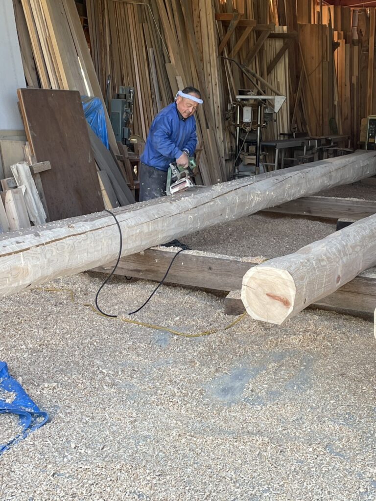 終の棲家「平屋」の小屋組みの丸太の刻みが始まりました。