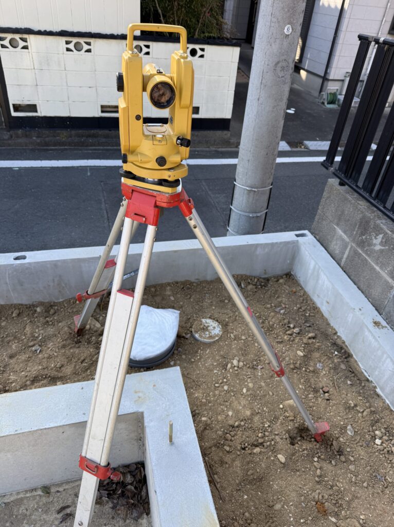 棟梁の所では、40年前からトランシットで、90度を振って、建物が歪みが無く設置できるようにセットしています。