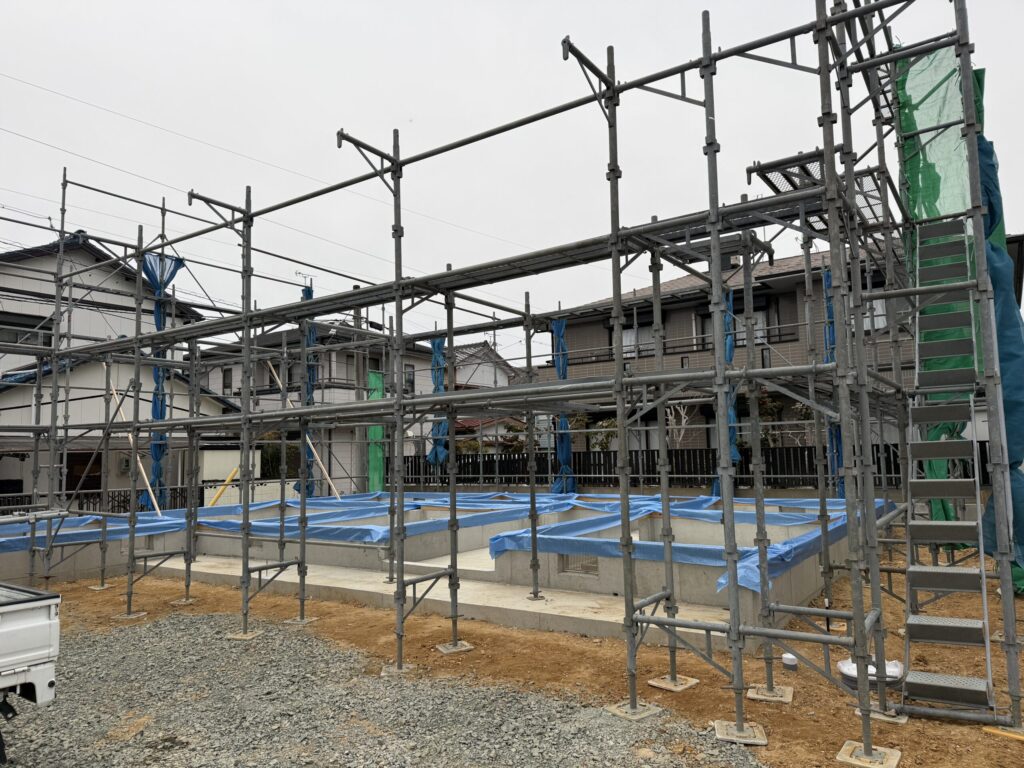 土台の設置工事も終わり、足場の設置も作業主任者の資格を持つ、棟梁と岩ちゃんで設置します。