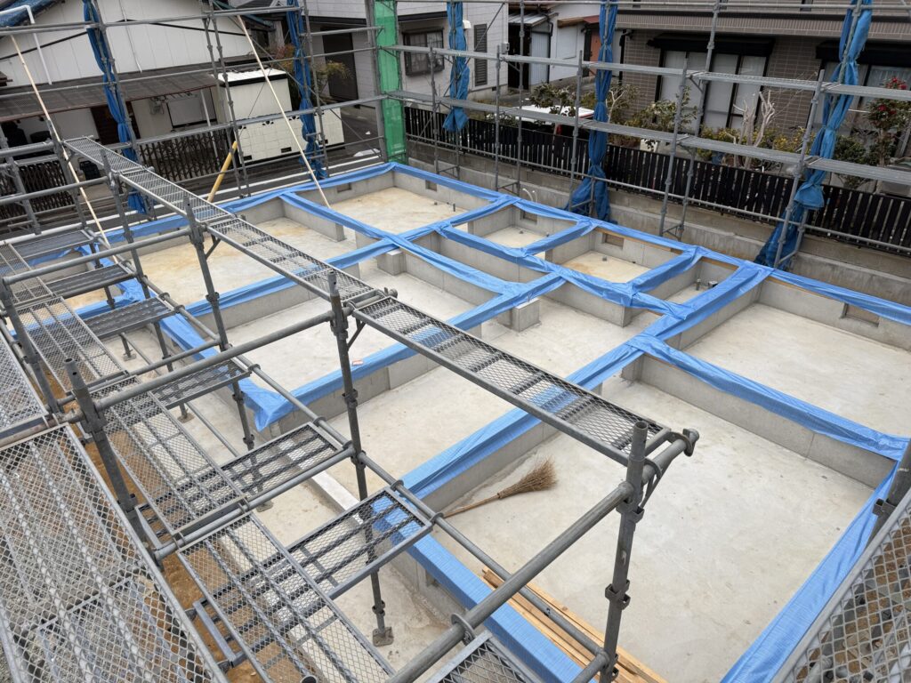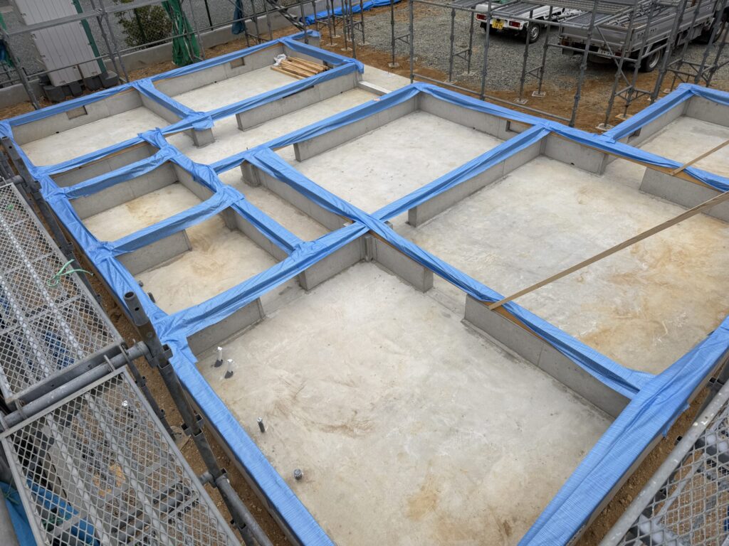 建前まで、すこし日にちが開くので、土台の上にシートを引いて雨にも濡れないように養生しておきました。